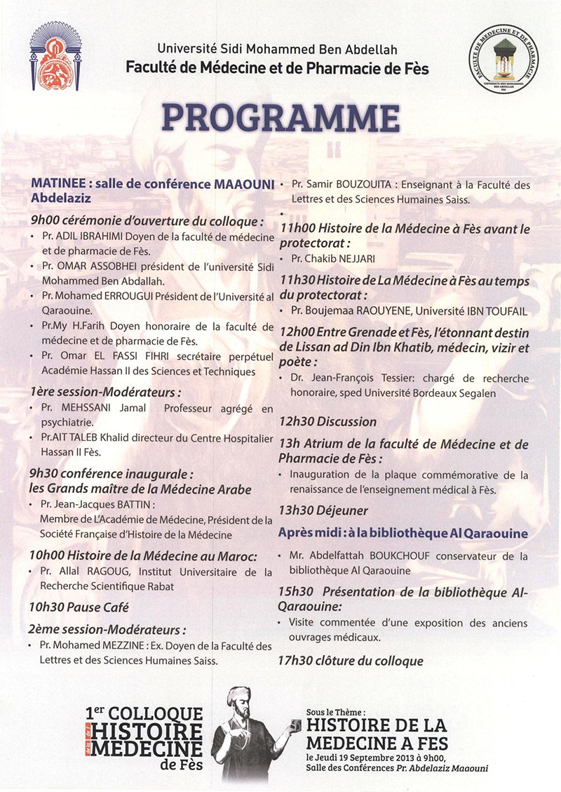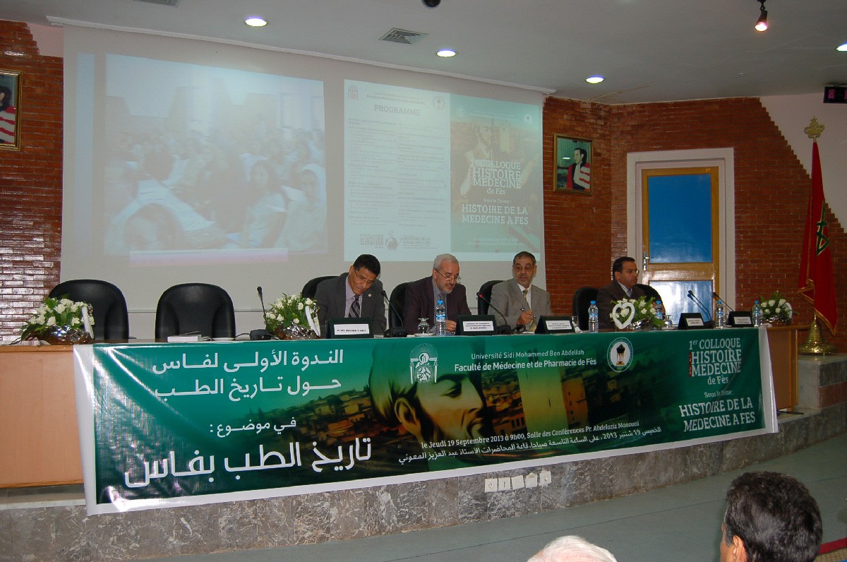 19 شتنبر 2013 | نظمت كلية الطب والصيدلة وطب الأسنان بفاس بدعم من جامعة سيدي محمد بن عبد الله الملتقى الأول لتاريخ الطب بفاس في موضوع : «تاريخ الطب بفاس» يوم 19 شتنبر 2013. افتتحت الجلسة بمحاضرة من تقديم الأستاذ «جون جاك باتان» عضو أكاديمية الطب ورئيس الجمعية الفرنسية لتاريخ الطب. في حين تمت مناقشة محاضرات أخرى تمحورت جلها حول موضوع الندوة. اختتمت فعاليات هذه الندوة بزيارة ميدانية لمكتبة القرويين العتيقة تم خلالها عرض الكتب والمخطوطات الطبية القديمة.